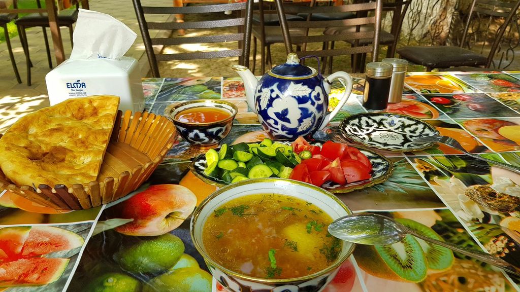 Свежий салат, шурпа, 0,5 лепёшки, мадор самса 2 шт., 2 шашлыка из баранины, чай с лимоном, 115 000 сум.
