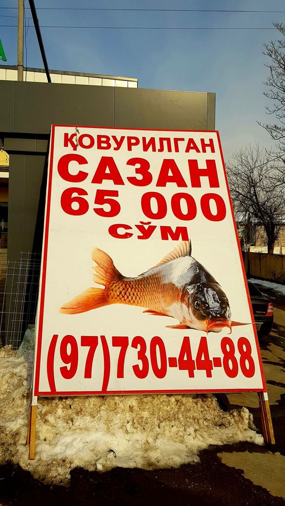 от автомобильного рынка на Сергели в сторону хокиията, ярмарки, Корзинки, метров 500, по левой стороне огромный баннер SAZANJON
