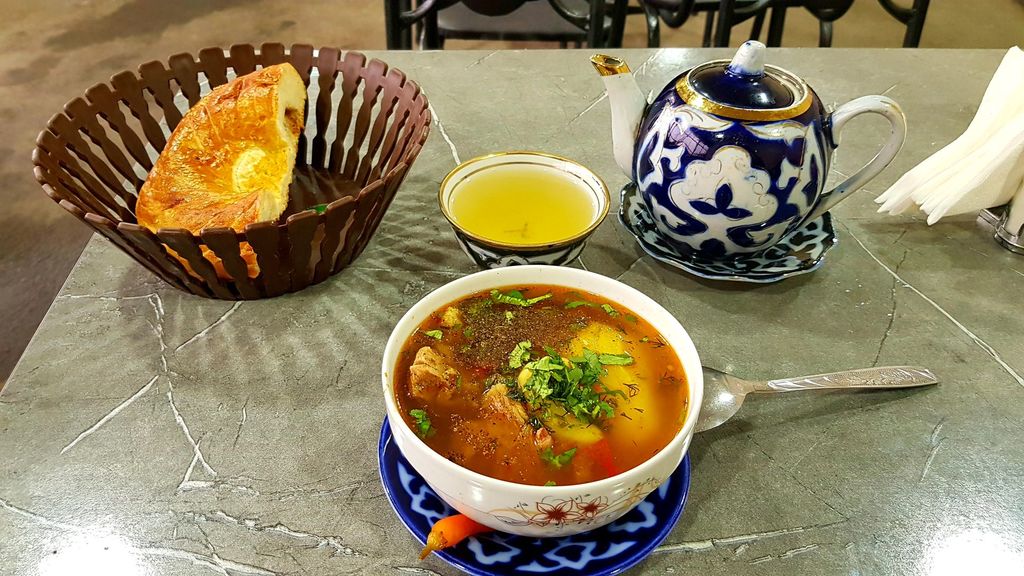 Шурпа, 2 шмата мяса, большой картофель, нут, насыщенный бульон, и всего 20 000 сум. Лепёшка и чай отдельно есстно.