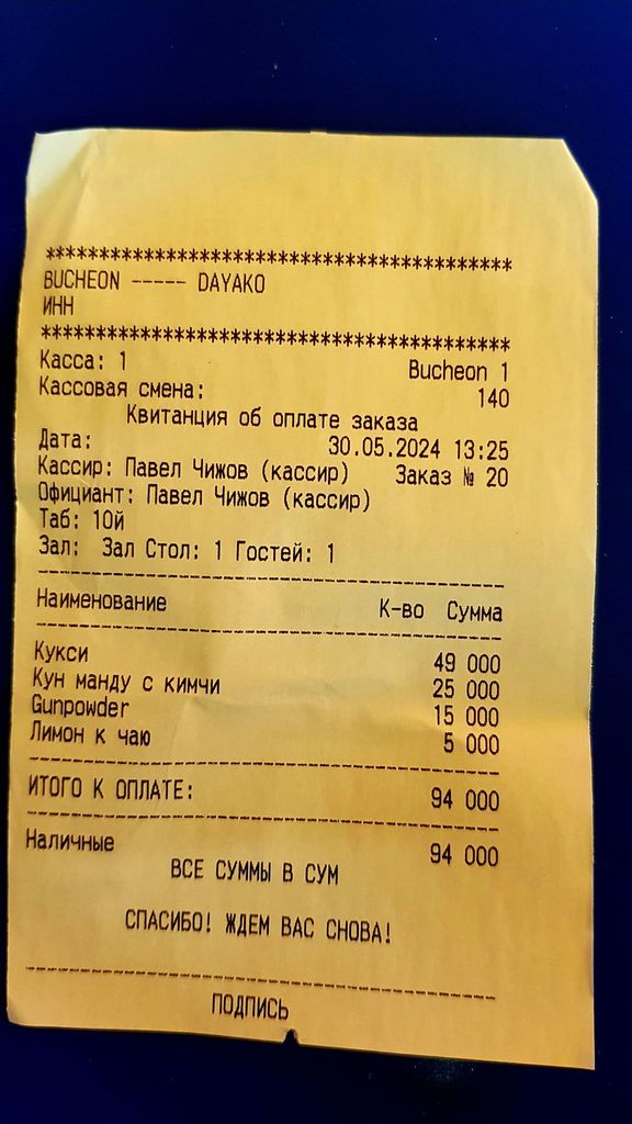 Но...нужно быть внимательным к чекам, после кукси захотелось сладкого, заказал капучино и пирожное, и только дома обратил внимание на фото, что пробили ещё эспрессо за 18 000 сум :dash2: