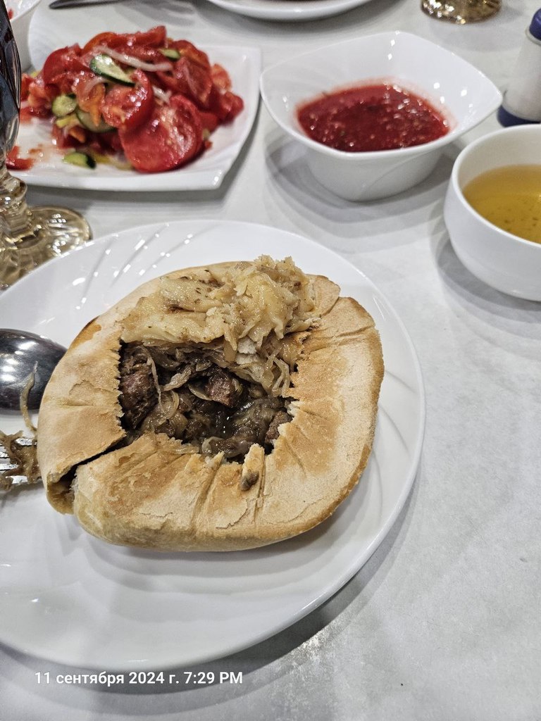 С салатом "Ташкент" -  отдельная история. В меню этого салата не было. На мой вопрос официант ответил, что он у них - в обеденном меню, по которому они обслуживают до 15:00 (мы пришли чуть позже). Попросили принести обеденное меню, чтобы понять стОит приходить туда еще раз или нет. Официант сначала решил, что мы просим принести обеденное меню, чтобы все-таки попытаться заказать что-то из него, и ответил отказом, но потом таки принес его :D В обеденном меню салата "Ташкент" опять не было :facepalme: На мой вопрос об отсутствии салата в обеденном меню официант объяснил, что обеденное меню у них меняется каждую неделю месяца. Вчера (в день нашего посещения) было меню четвертой недели, а салат "Ташкент" у них входит в меню третьей недели, и, соответственно, попробовать его у них в ресторане можно будет только через 2,5 недели :facepalme: :D