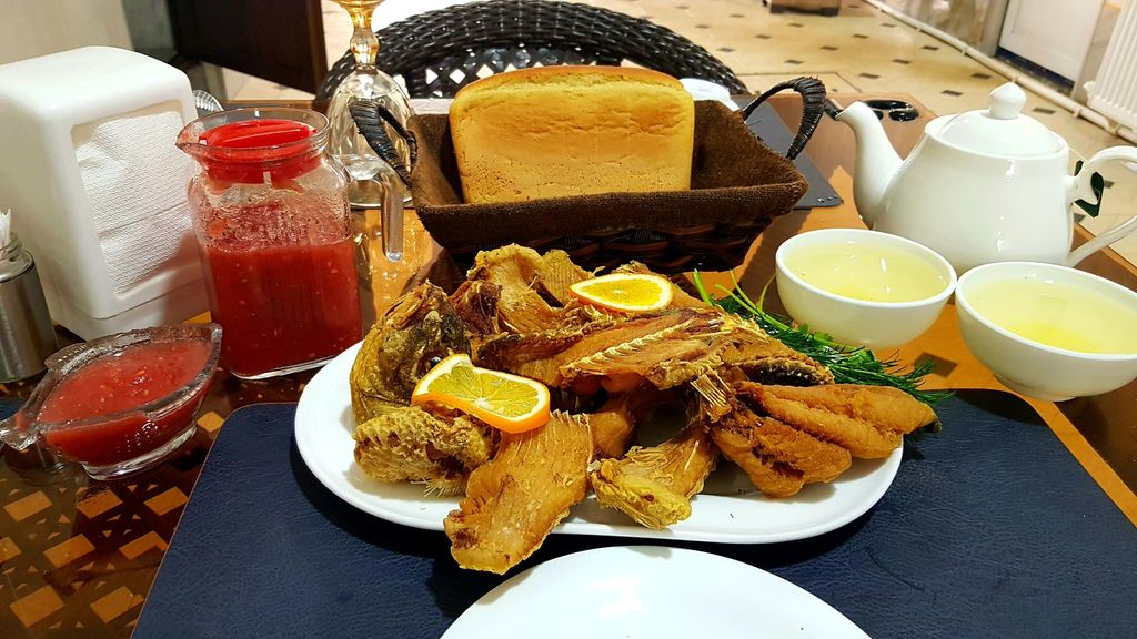 Там основное блюдо- хлеб, целая буханка. После того, как взял живого сазана по 75тс, ну очень жирного, перешёл на филе пангасиуса и минтая по 50тс.