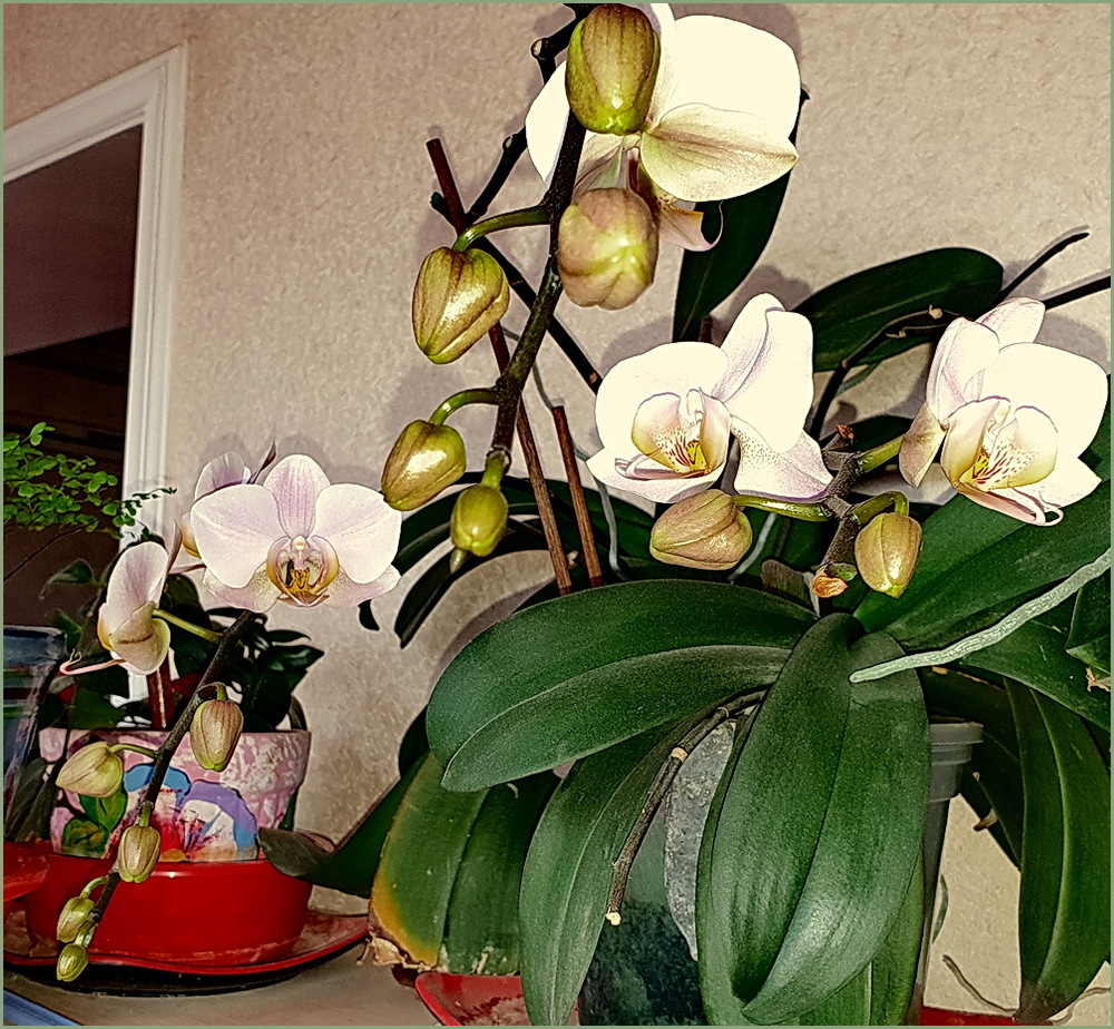 Условия у нас для них ужасные, балкон строго на север, из за этого тянутся к окну, пока молодые были, цветонос 40-50 см вытягивали, сейчас по 2-3 цветоноса, но короткие.. и почти горизонтальные..