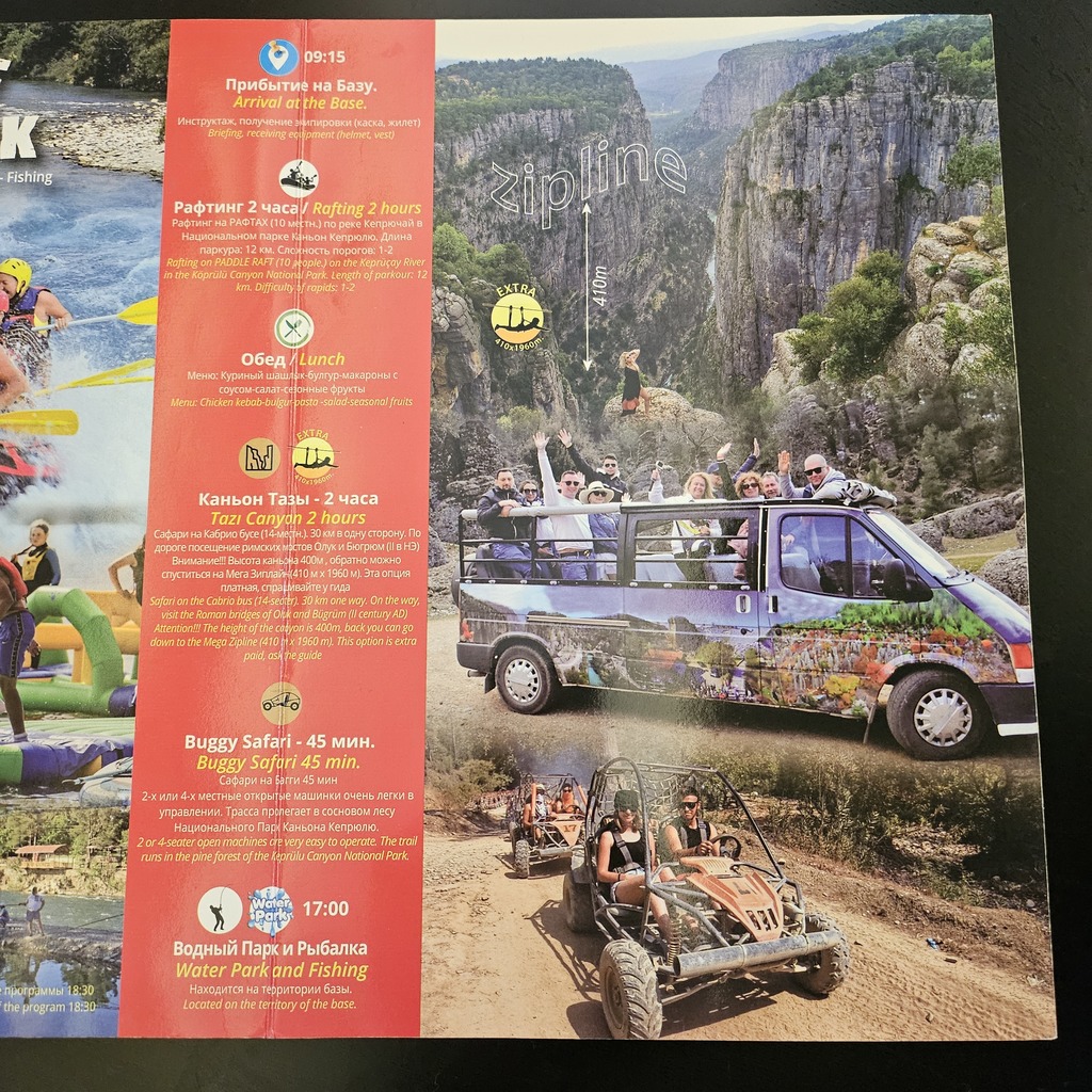 Вчера на день мотались на экскурсию в область каньона Тазы (50 км восточнее от Анталии, 1.5 езды от нас). Езда на сафари джипах по горным серпантинам, осмотр самого каньона (для особо смела над каньоном можно прокатиться на зиплайне 2 км за 3 мин - 80 баксов доп. оплата), далее ралли на багги картах по пыльным бездорожным путями, где грязь и камни. А после обеда самая главная изюминка экскурсии - рафтинг по бурной речке, длится целых 1.5 часа. Вода приятно прохладная, инструктора турки которые сносно говорят по русски, плывем гребем на перегонки, устраиваем морские бои, пытаясь как можно сильнее облить водой соперников. Вокруг лесистые гора, чистая река - лепота от ним словом. Дети тоже участвуют от 6 лет, кстати.