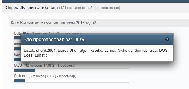 Posted 26.12.2016 06:38 Я не поняла. Написано Опрос: Лучший автор года (139 пользователей проголосовало) а посчитала реально 76 пользователей проголосовало. У нас как в США - коллегия выборщиков что ли? 0 Share this post Link to post Share on other sites