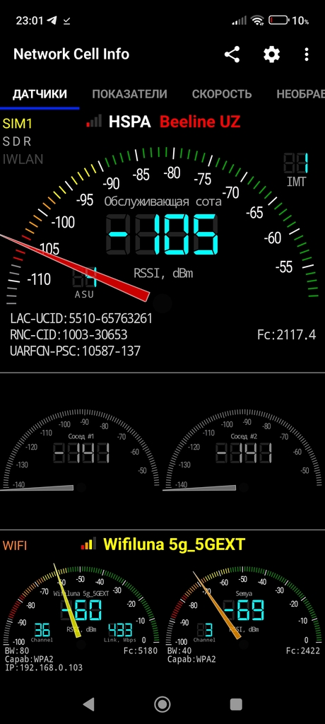 И у тебя на скринах вообще нет работы LTE - "ежик", 3G (HSPA) и твой WiFi. Т.е. в момент работы проги 4G однозначно не пашет (или из-за глюков/настроек телефона, или из-за покрытия сети в конкретном месте). При этом уровни сигнала конечно дохлые (может зона покрытия такая и виноват опсос, может таки траблы тела).Вот нормальные уровни сигнала